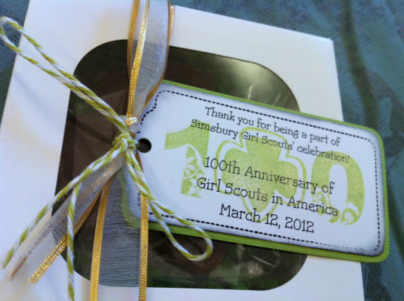 The ladies who planned our event asked me if I would be willing to make some tags to attach to gift boxes for some very special guests. I immediately remembered that I had a Close to My Heart stamp about Girl Scouting. I typed up a message about the 100th celebration, printed it out, and then stamped with green ink over the message. I stamped again over that with shimmer paint to give some gold sheen.