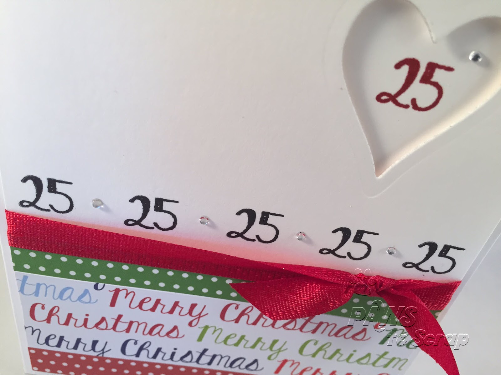 Some simple strips of pattern paper with a ribbon border. Some stamped "25's", with one tucked into a window. I am loving all that white space.