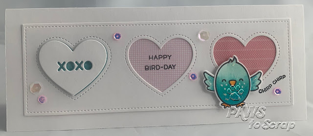 I did go with a slimline design using the die from last year's release. Valentine stamps and dies to make a CAS birthday greeting. And yes, there's a little dimension, but I tried to keep some white space.
